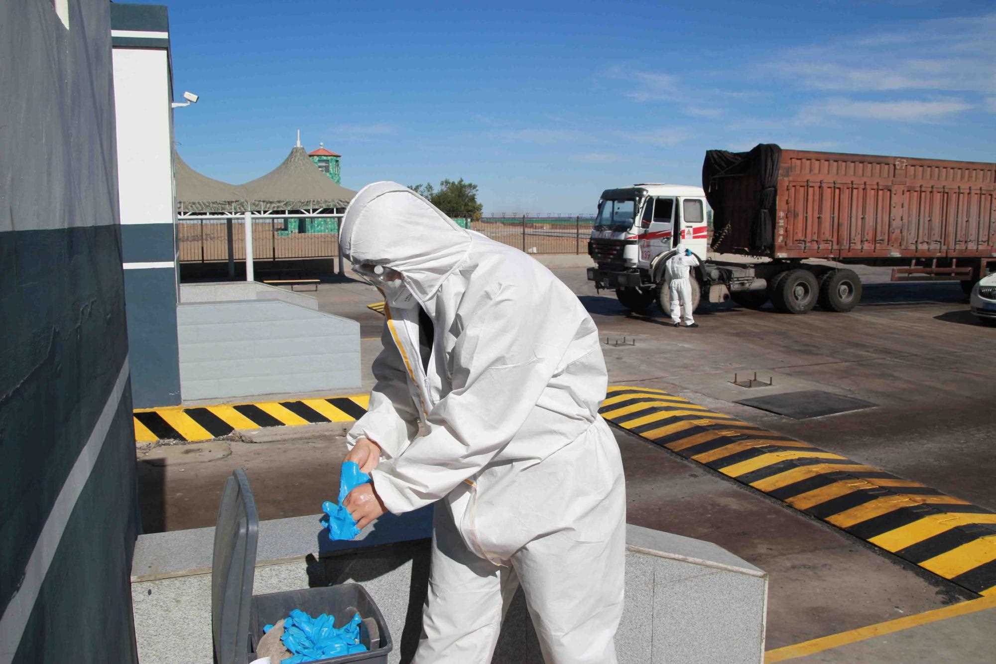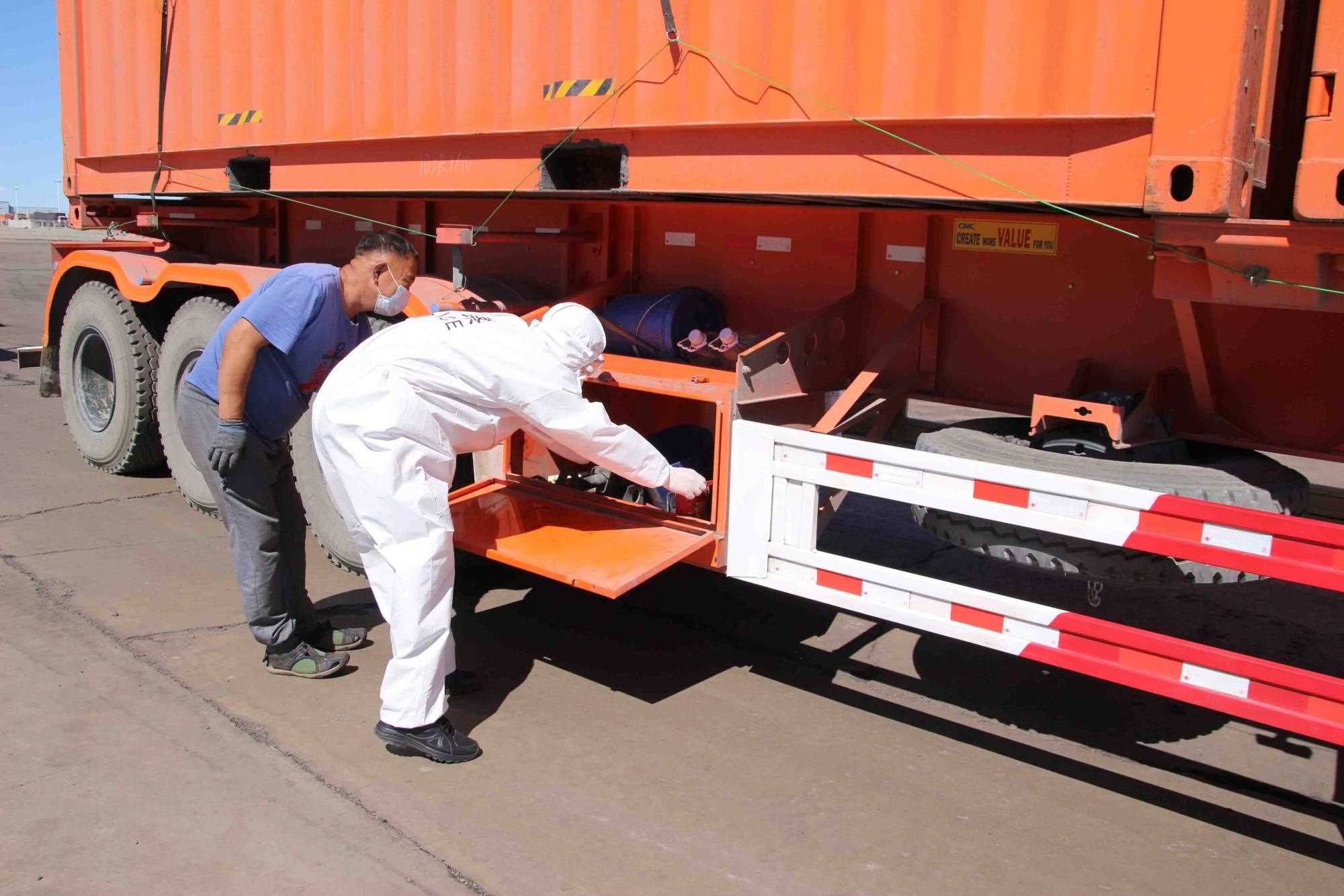 近期策克口岸的溫度持續(xù)增加至30攝氏度以上,而在通行的重型卡車,溫度還要更高,下午15點(diǎn)溫度計(jì)地表溫度測(cè)量最高可達(dá)40攝氏度。這無(wú)疑讓的查驗(yàn)工作更為繁重。更重要的是,由于疫情影響每名民警在查驗(yàn)期間都要穿上防護(hù)服,在高溫下,由于防護(hù)服是密閉的,防護(hù)服里仿佛成了蒸箱,用不了十分鐘,民警就會(huì)汗流浹背,防護(hù)服黏在身上又粘又癢,一班勤務(wù)近2個(gè)小時(shí),必須要等過(guò)了勤務(wù)才能休息,而民警還要完成車體的查驗(yàn)工作,包括工具箱、馬槽等處,絲毫不敢馬虎。