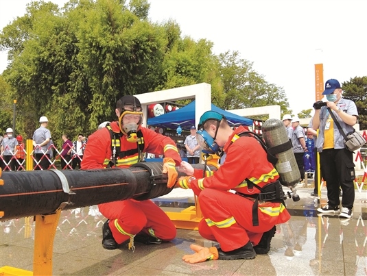 陣陣白煙模擬的是道路中壓燃?xì)夤艿佬孤?,接到?bào)警后,119消防指揮中心第一時(shí)間通過(guò)應(yīng)急聯(lián)絡(luò)系統(tǒng)通知住建部門(mén)和燃?xì)馄髽I(yè)到場(chǎng)處置,同時(shí)消防救援力量到達(dá)現(xiàn)場(chǎng)對(duì)泄漏點(diǎn)進(jìn)行處置。接到通知后,中浩燃?xì)夤緭屝藜皯?yīng)急處置人員到達(dá)現(xiàn)場(chǎng),對(duì)泄漏區(qū)域20米范圍內(nèi)進(jìn)行圍擋警戒,并攜帶可燃?xì)怏w檢測(cè)儀對(duì)周邊環(huán)境進(jìn)行檢測(cè),以防人員受傷,保證作業(yè)安全。應(yīng)急處置人員佩戴空氣呼吸器進(jìn)入現(xiàn)場(chǎng),確定漏點(diǎn)及管道尺寸,用膠帶對(duì)漏點(diǎn)進(jìn)行臨時(shí)處理,加裝管道抱卡,臨時(shí)封堵管道?,F(xiàn)場(chǎng)指揮人員根據(jù)處置情況,集結(jié)隊(duì)伍,利用運(yùn)行不停輸維修設(shè)備進(jìn)行管道維修。這一連串的操作下來(lái),泄漏點(diǎn)被及時(shí)修好。負(fù)責(zé)此次演練的內(nèi)蒙古中浩燃?xì)庥邢薰究偨?jīng)理賈鵬程介紹,這套不停輸管道維修設(shè)備,既節(jié)約了成本,又能保證安全供氣,能更好地服務(wù)保障廣大市民群眾。