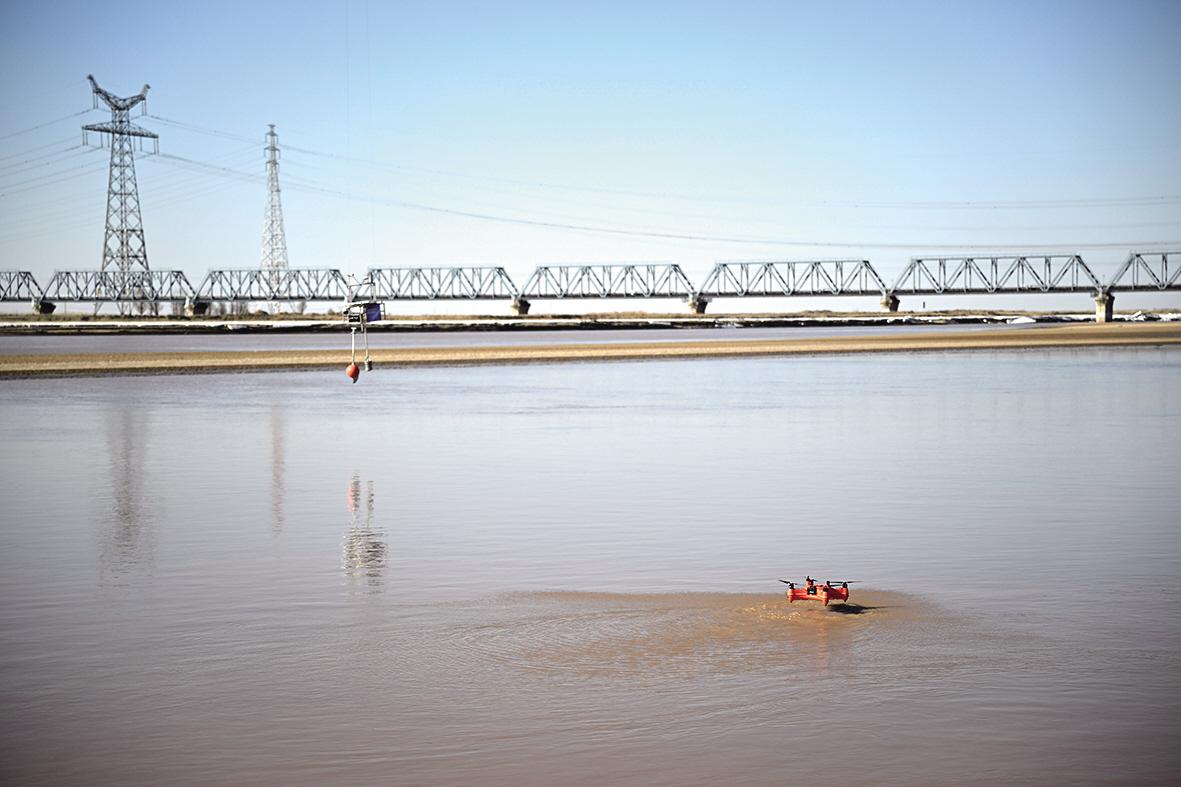 近日,隨著氣溫回升,黃河內(nèi)蒙古段多處已進(jìn)入開河期,有關(guān)部門有序開展防凌工作,確保黃河內(nèi)蒙古段全線穩(wěn)定開河。圖為3月17日在內(nèi)蒙古包頭市黃河水利委員會寧蒙水文水資源局包頭水文站拍攝的測深測速兩棲無人機(jī)。