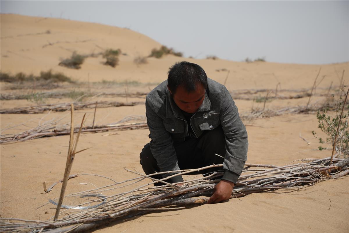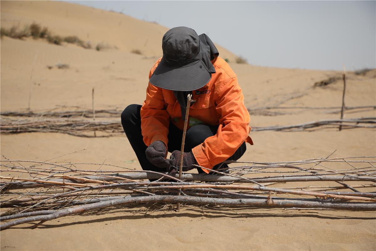 在鄂爾多斯市庫(kù)布其沙漠S215穿沙公路沙化土地綜合治理項(xiàng)目現(xiàn)場(chǎng),工人正在固定沙障。(資料圖)