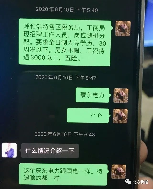 “呼和浩特各區(qū)消防大隊招聘辦公室內(nèi)勤人員,工資待遇3500元左右?!薄案咚俳痪羰兄ш?一支隊)輔警,工資和五險一金,4200元?!薄昂艉秃铺馗鲄^(qū)稅務(wù)局、工商局現(xiàn)招聘工作人員,崗位隨機分配。”“呼和浩特婦幼保健院招聘護士,大專學(xué)歷”……記者在民警繳獲的程某某的手機上看到,6月8日以來,程某某和趙某某的聊天記錄中,發(fā)送了多條諸如此類的招聘信息。