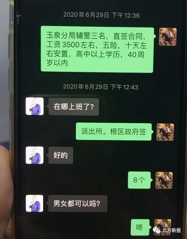 6月30日,大南街派出所民警在日常工作中發(fā)現(xiàn),有人在朋友圈發(fā)布了這樣一條信息:“玉泉區(qū)公安分局招聘輔警3名,直簽合同,工資3500元左右,五險,十天左右安置,高中以上學(xué)歷……”信息末尾留有手機號碼。