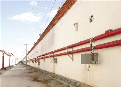 在臺閣牧鎮(zhèn)沙家營村,記者看到供熱管網(wǎng)改造施工時開挖的街巷已完成路面硬化;換熱站內(nèi)運轉(zhuǎn)的機器隆隆作響,輸送熱源的管道摸起來十分燙手;在成排的居民房屋后墻整齊地安裝了包裹保溫材料的供熱管道和計量表箱,暖氣經(jīng)由這些管道輸送到各家各戶。