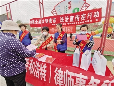 近日,玉泉區(qū)司法局西菜園司法所聯(lián)合正信公證處、祺翰律師事務(wù)所、鵬旭律師事務(wù)所、盛恒律師事務(wù)所在西苑家園小區(qū)廣場開展了創(chuàng)城法治宣傳活動(dòng)。(記者 其布日哈斯 攝)