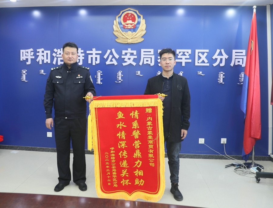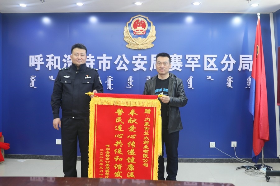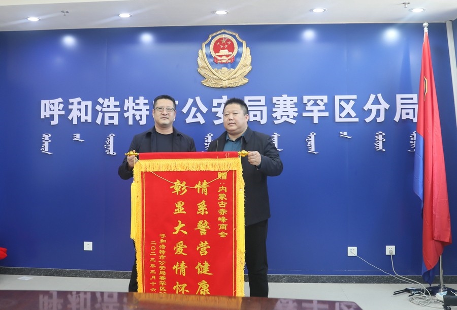 賽罕區(qū)副區(qū)長、公安分局局長趙新龍,政委郭震乾等領(lǐng)導(dǎo)熱情接待了商會(huì)和愛心企業(yè)負(fù)責(zé)人,并向商會(huì)及愛心企業(yè)贈(zèng)送錦旗以示感謝。