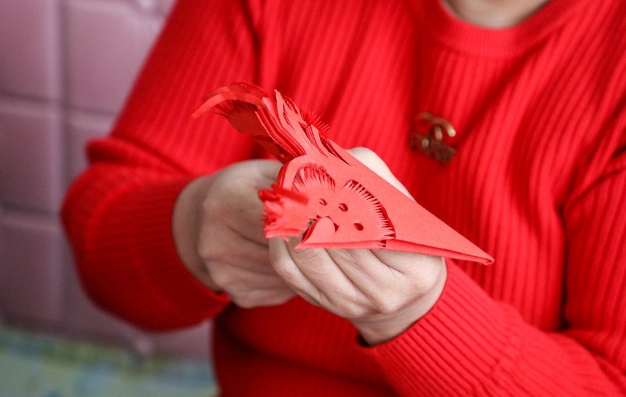 北疆新聞呼和浩特1月22日消息(記者 楊凈毓)春節(jié)將至,日前,在內(nèi)蒙古呼和浩特市土默特左旗畢克齊鎮(zhèn),土默特剪紙非遺傳承人李還秀和姐妹們?cè)诳活^上剪窗花,非遺傳承人孟素英手工捏制“龍”樣面塑,準(zhǔn)備迎接“龍”年的到來(lái)。