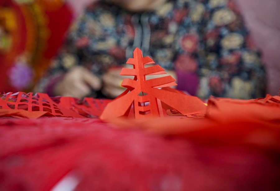 土默特剪紙非遺傳承人李還秀正和姐妹們?cè)诳活^上剪窗花