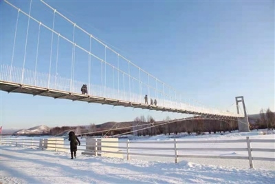 新建的“守望相助橋”橫跨根河兩岸,連接市區(qū)和蒼狼山原生態(tài)景區(qū),是一處集自然景觀和人文景觀于一體的新景點。橋面距離封凍的冰河十幾米高,造型優(yōu)美、張力十足。橋梁只供行人通過,站在橋上看過去,腳下是清澈透明的冰河,遠(yuǎn)處是原始森林,獨特的美景盡收眼底。