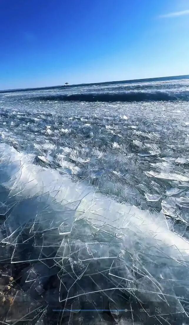 在無人機(jī)航拍視角下,2239.9平方公里的湖面上,冰排與未完全封凍的水域交織分布,白色冰體與湛藍(lán)湖水相映,宛如大地鋪展的巨型碧玉上鑲嵌的銀紋??拷行牡膮^(qū)域,新凍結(jié)的冰層還呈現(xiàn)出細(xì)膩的冰花紋路,而岸邊的冰排群中,隱約可見因地下泉眼涌動(dòng)形成的“清眼”,表面覆著薄霜,在陽光下泛著微光。