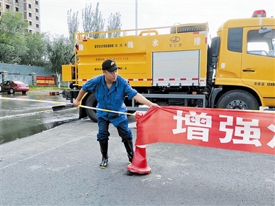 在這之前,通遼市排水管理處已啟動應(yīng)急預(yù)案,搶險(xiǎn)人員及應(yīng)急搶險(xiǎn)車輛陸續(xù)就位。負(fù)責(zé)明仁立交橋排水搶險(xiǎn)的第2小組的4名成員兵分兩路,需要勸退東、西兩側(cè)準(zhǔn)備過橋的汽車司機(jī)和行人,以及排布車輛、施拉警界線……橋西邊,污水管道維護(hù)隊(duì)車隊(duì)隊(duì)長張?jiān)僦沁吤χ掷锏幕顑?,邊通過對講機(jī)呼叫副隊(duì)長盛博,催促他趕緊向過往的車輛及行人喊話,提醒大家橋下水深不能通行。此時(shí),盛博已駕車由西向東行至立交橋南側(cè)的輔路上,雨水遮住了視線,雨刮器速度越來越快,他邊回應(yīng)張?jiān)僦?,邊放慢車速向人們喊話?/p>