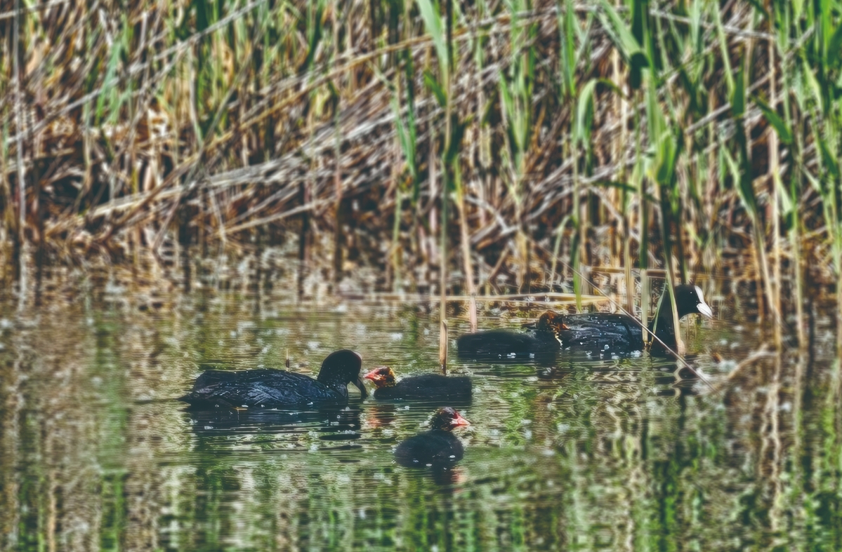 在不遠(yuǎn)處的水域,白骨頂雞一家成為眾人關(guān)注的焦點。幾只剛剛出窩的幼鳥,圓滾滾、毛茸茸的,正好奇地在水中游動,動作略顯笨拙,還不時發(fā)出稚嫩的叫聲。成年白骨頂雞則忙著覓食,它們一頭扎進(jìn)水里,再浮出水面時,嘴里已叼著小魚小蝦,隨后快速游向幼鳥喂食。幼鳥們爭搶食物的場景,充滿了趣味。