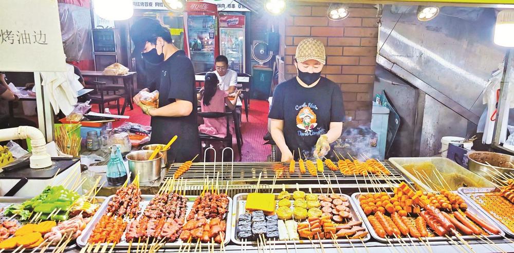 炭火上的羊肉串嗞嗞作響,油脂滴落,迸出金色火花,散發(fā)出誘人的香氣??腿藝谒芰闲∽琅?,手里拿著冰鎮(zhèn)啤酒,碰杯傳出清脆的響聲……這里沒有高檔餐廳的拘謹(jǐn),只有朋友相聚的歡樂和大口吃肉的暢快。大學(xué)生徐瑞虹放暑假后,經(jīng)常和朋友來夜市消暑?!拔覀儙讉€沒事就來萬達(dá)金街轉(zhuǎn)一轉(zhuǎn),天太熱了,待在家里也悶,而且夜市里的這些小吃我們都比較喜歡,沒事幾個人喝幾瓶啤酒,聊一聊天,感覺還是很愜意的?!睂τ谀贻p人來說,夜市不僅是美食的聚集地,更是釋放壓力、享受生活的好去處。在這里,他們可以暫時拋開煩惱,盡情享受美食帶來的快樂。