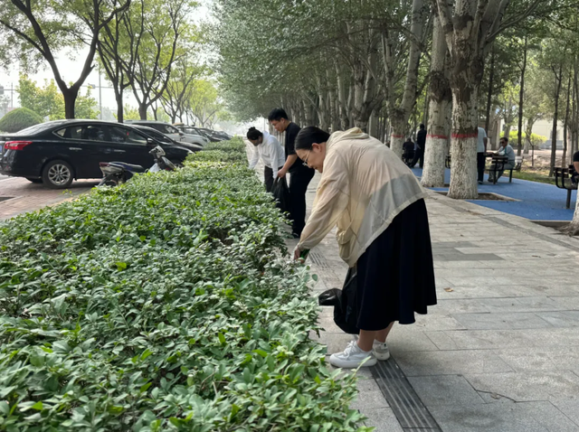 田永成今年66歲,精神矍鑠,手里拿著一把夾子,彎著腰仔細(xì)地在草坪上搜尋垃圾。“看到‘美城有我’城市清潔日行動的倡議書,我立馬就給隊(duì)員們打了電話,大家都特別積極,好多人報(bào)名參與?!碧镉莱尚χf,額頭上的汗珠順著臉頰滑落。