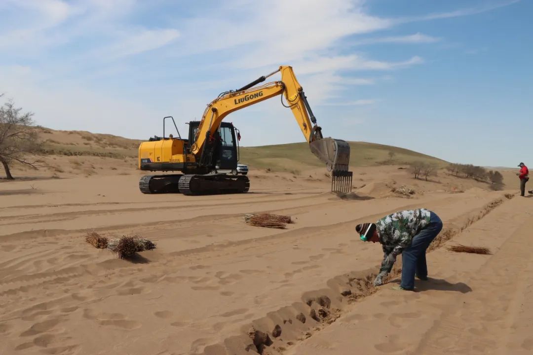 據(jù)錫林浩特市二蛋牧民養(yǎng)殖專業(yè)合作社負(fù)責(zé)人介紹,在傳統(tǒng)的沙漠治理作業(yè)中,工人需要手動(dòng)栽植黃柳等固沙植物。然而,人工種植不僅效率低,勞動(dòng)強(qiáng)度也大。為突破這一困境,合作社成員經(jīng)過多次試驗(yàn),最終決定對(duì)挖掘機(jī)進(jìn)行創(chuàng)新改造,加裝叉具,這一巧妙的設(shè)計(jì)不僅實(shí)現(xiàn)了對(duì)黃柳種植深度和間距的精準(zhǔn)把控,還能有效避免土壤翻動(dòng),最大程度地保持了土壤水分,切實(shí)保護(hù)了沙地的生態(tài)環(huán)境。