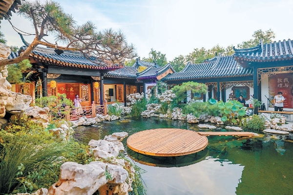 園中一泓池水,清澈如鏡,廊、軒、亭、榭環(huán)繞四周,夾岸有疊石、綠植、繁花,明朗清雅。后樓為展廳,中國(guó)當(dāng)代水墨藝術(shù)家彭薇的作品《有故事的房間》正在展出,觀眾散落其間,駐足欣賞。