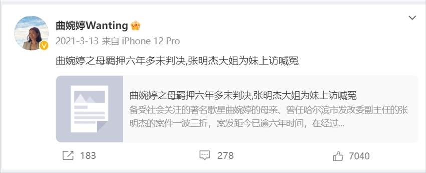 此后,曲婉婷多次在微博發(fā)文,為其母親“喊冤”。