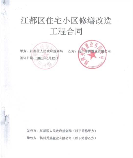 《江都區(qū)住宅小區(qū)修繕改造工程合同》封面,上面蓋有“揚州市江都區(qū)規(guī)劃局”的假章。