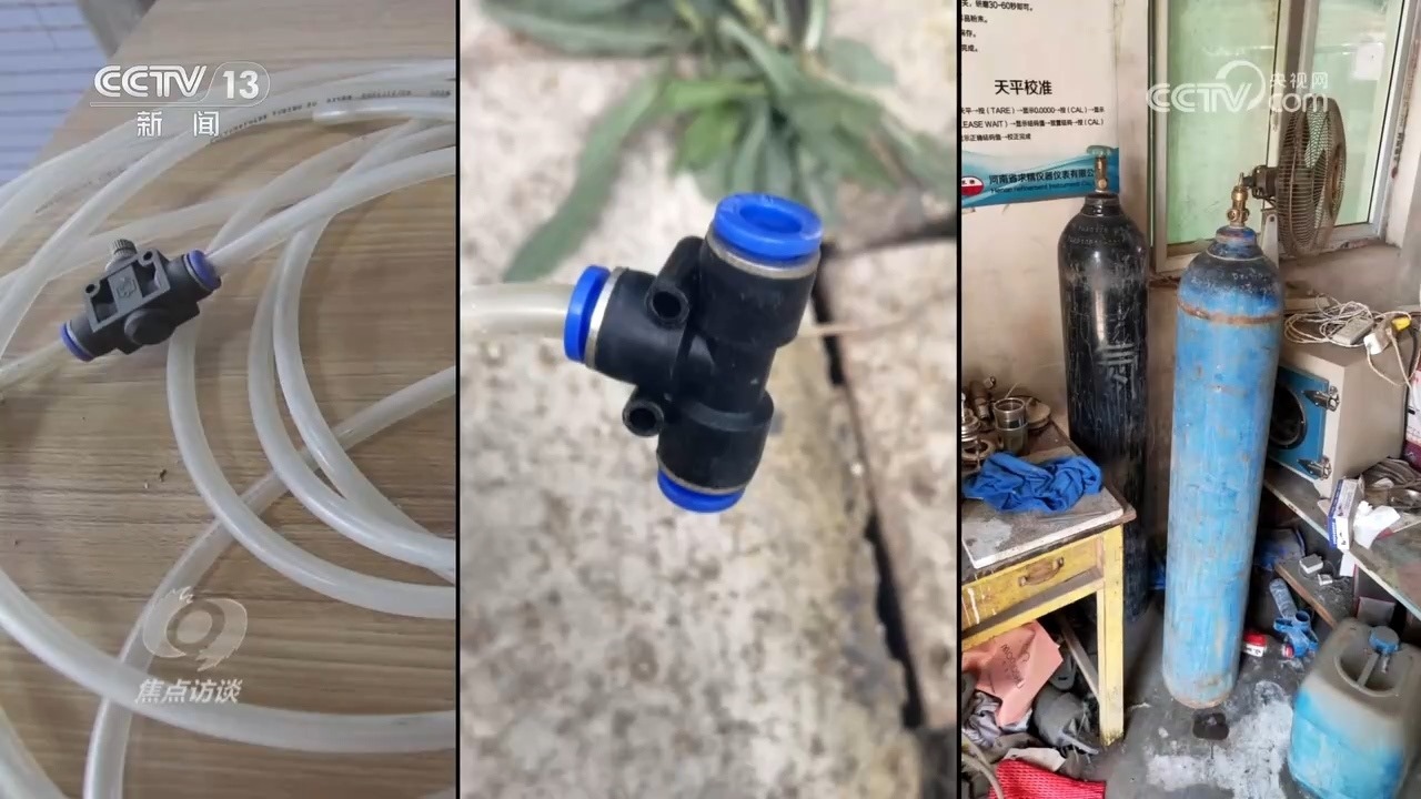 塑料軟管、三通管件、氮氣瓶,就是“環(huán)??萍脊尽钡娜藖斫o磚廠安裝的所謂“環(huán)保設備”,他們把氮氣接入采樣管線,稀釋采樣氣體,從而達到干擾在線監(jiān)測數(shù)據的目的。
