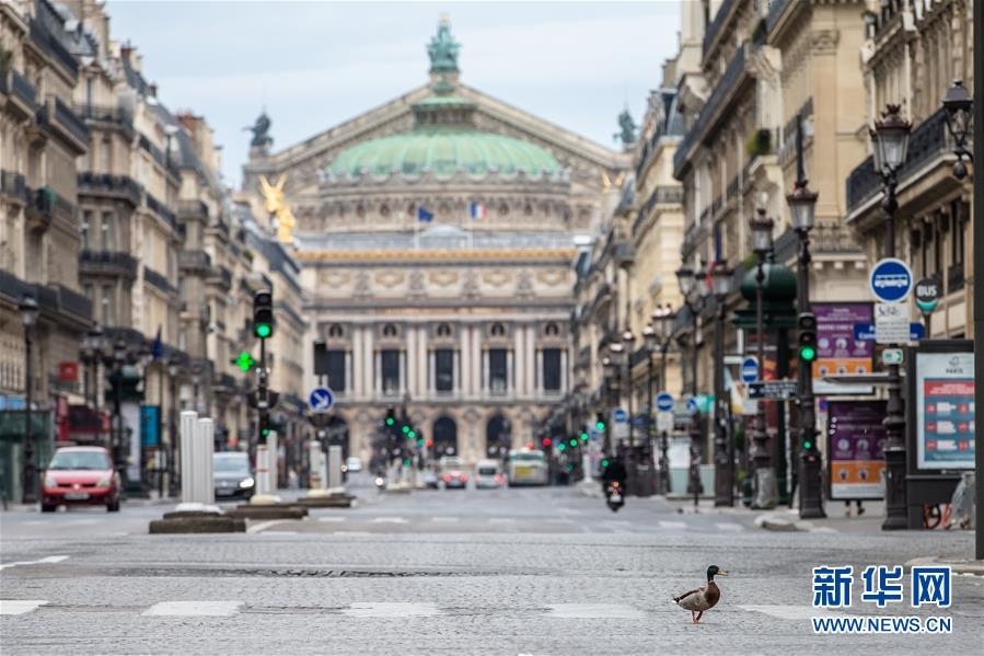 這是4月6日,在法國巴黎,一只鴨子在巴黎歌劇院前的大道上“溜達(dá)”?!敖懔睢睂?shí)施期間,不少動(dòng)物“溜達(dá)”到巴黎空蕩無人的大街上。新華社發(fā)(奧雷利安·莫里薩爾攝)