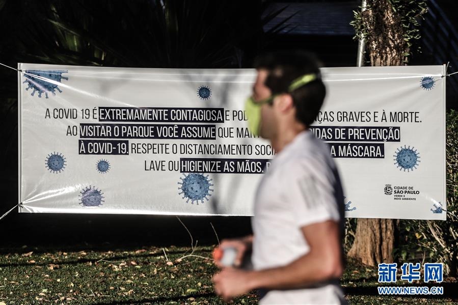 這是7月13日,在巴西圣保羅市重新開放的伊比拉普埃拉公園內(nèi),一名男子經(jīng)過提醒游客做好防護(hù)的條幅。新華社發(fā)(拉赫爾·帕特拉索攝)