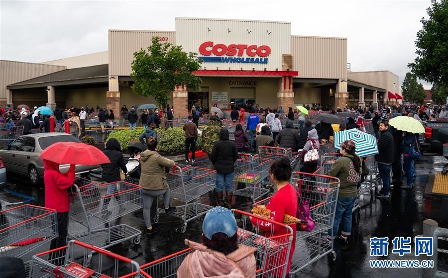 這是3月14日,在美國洛杉磯一家超市外,民眾冒雨排隊(duì)等候開門購物。新華社發(fā)(錢衛(wèi)忠攝)