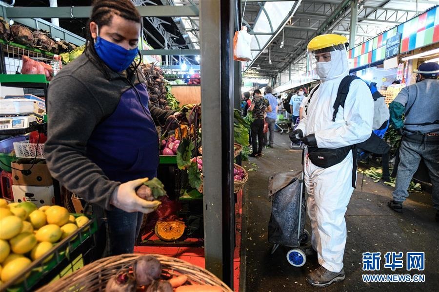 這是4月16日,身穿防護(hù)服的顧客在智利圣地亞哥拉貝加中心市場采購。新華社發(fā)(豪爾赫·比列加斯攝)