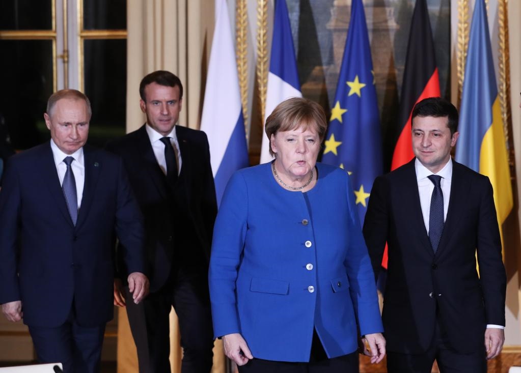 2019年12月9日,在法國巴黎,(從左到右)俄羅斯總統(tǒng)普京、法國總統(tǒng)馬克龍、時(shí)任德國總理默克爾和烏克蘭總統(tǒng)澤連斯基出席“諾曼底模式”四國峰會(huì)。(新華社記者高靜攝)