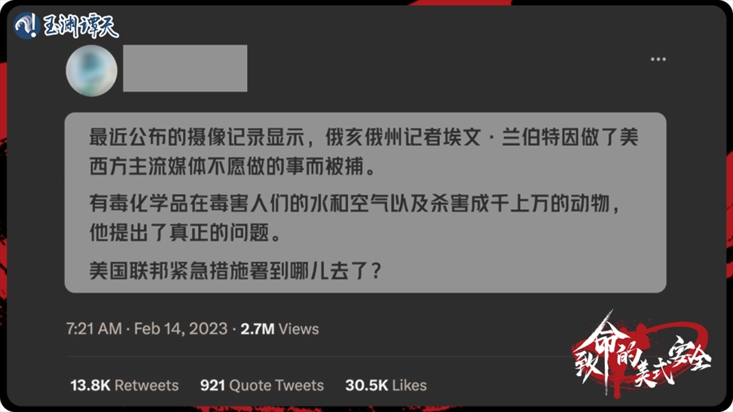 2月3日,俄亥俄州一列運載有毒化學(xué)品的列車脫軌并著火,久久不能確定下來的污染范圍和程度,最終引發(fā)了全世界的擔(dān)憂。