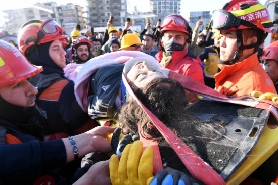 2月9日,在土耳其哈塔伊省安塔基亞市,中國救援隊(duì)與土耳其救援隊(duì)轉(zhuǎn)移一名救出的女性幸存者。