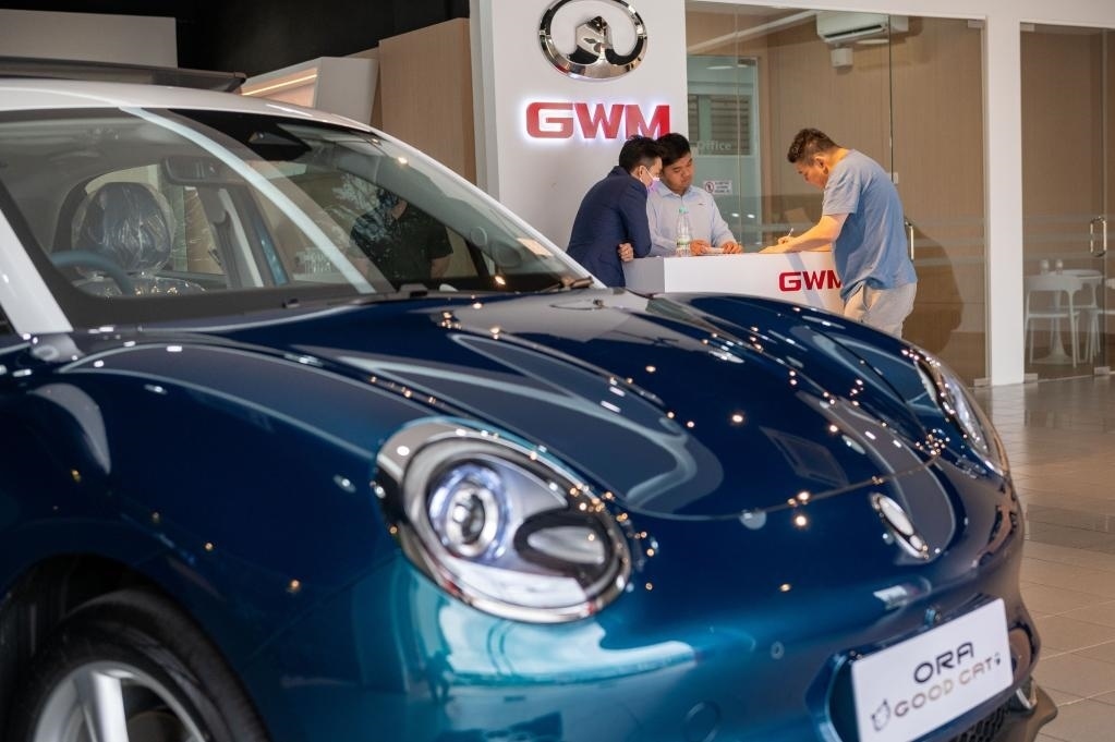 2月17日,在馬來西亞吉隆坡,一名顧客準(zhǔn)備試駕中國長城汽車旗下的歐拉好貓新能源汽車。