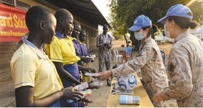 中國第九批赴南蘇丹(朱巴)維和步兵營長巡分隊(duì)官兵在丹蒙加拉為當(dāng)?shù)貎和?zèng)送文體用品。 中國赴南蘇丹(朱巴)維和步兵營供圖