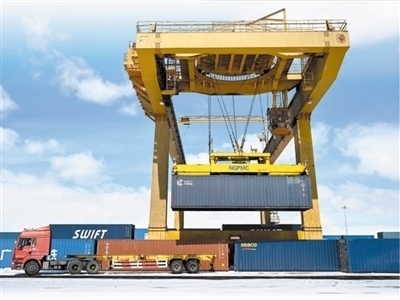 一輛貨車在滿洲里站貨運(yùn)車間集裝箱場(chǎng)裝卸集裝箱。滿洲里口岸是中國最大的陸路口岸,也是中歐班列東通道進(jìn)出境重要口岸。新華社記者 貝 赫攝