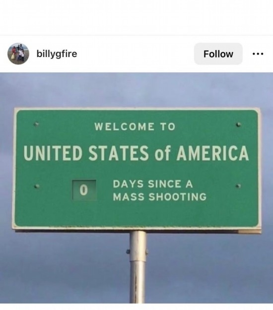 網(wǎng)友Billygfire創(chuàng)作了一塊高速公路廣告牌,上面寫道:“歡迎來到美國,距離上一次大規(guī)模槍擊已經(jīng)過了0天。”