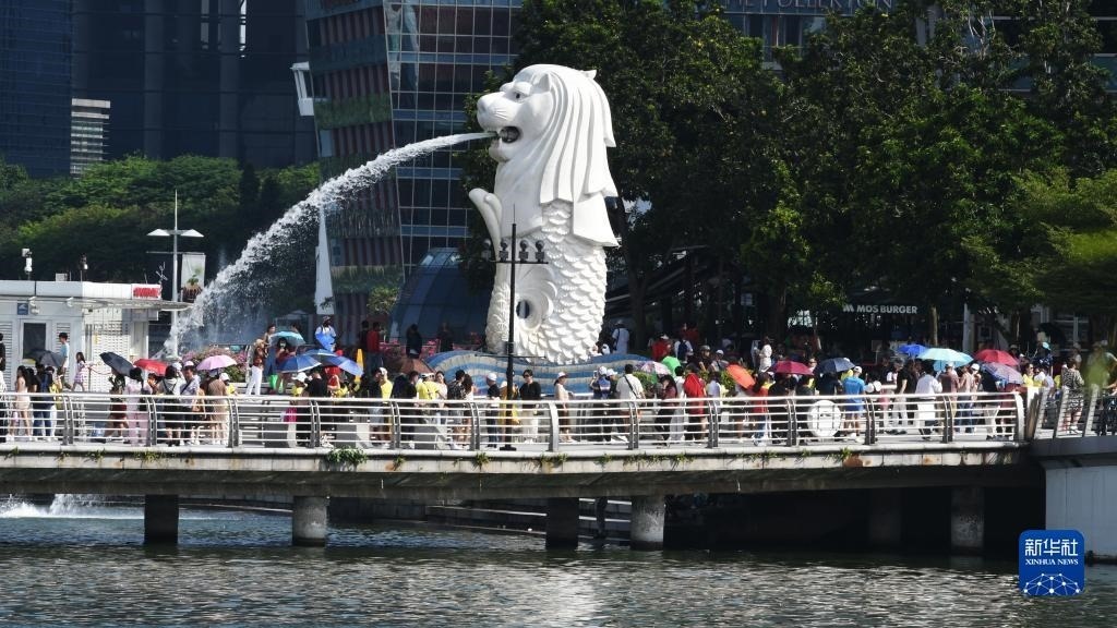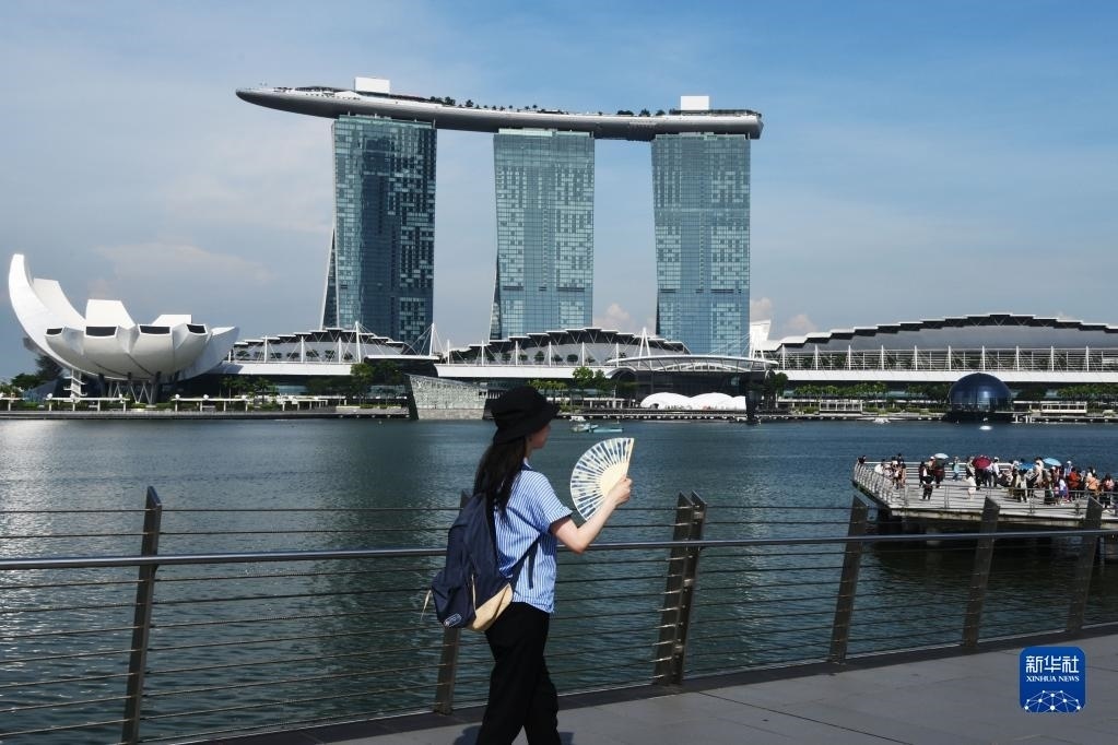 5月18日,在新加坡濱海灣,很多人用傘遮陽(yáng)。