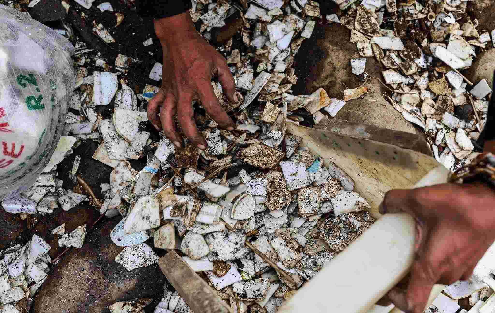 當(dāng)?shù)貢r間2023年1月2日,孟加拉國錫爾赫特,工人們在一個有毒廢物傾倒場工作。