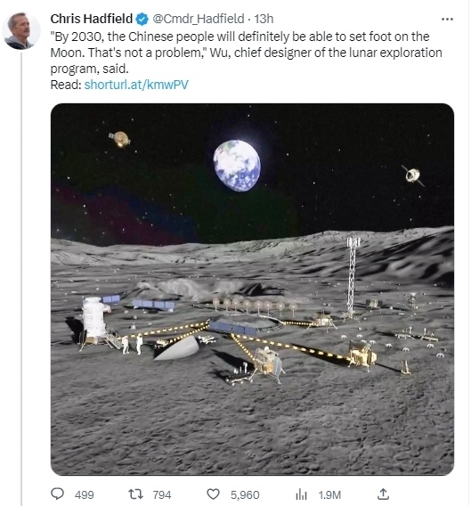 據(jù)報(bào)道,加拿大航天局前宇航員克里斯·哈德菲爾德在社交媒體推特上轉(zhuǎn)發(fā)了CGTN的一篇報(bào)道,他同時(shí)寫(xiě)道,“中國(guó)探月工程總設(shè)計(jì)師吳偉仁說(shuō),‘到2030年,中國(guó)人的足跡一定能夠踏上月球。這不是個(gè)問(wèn)題。’”