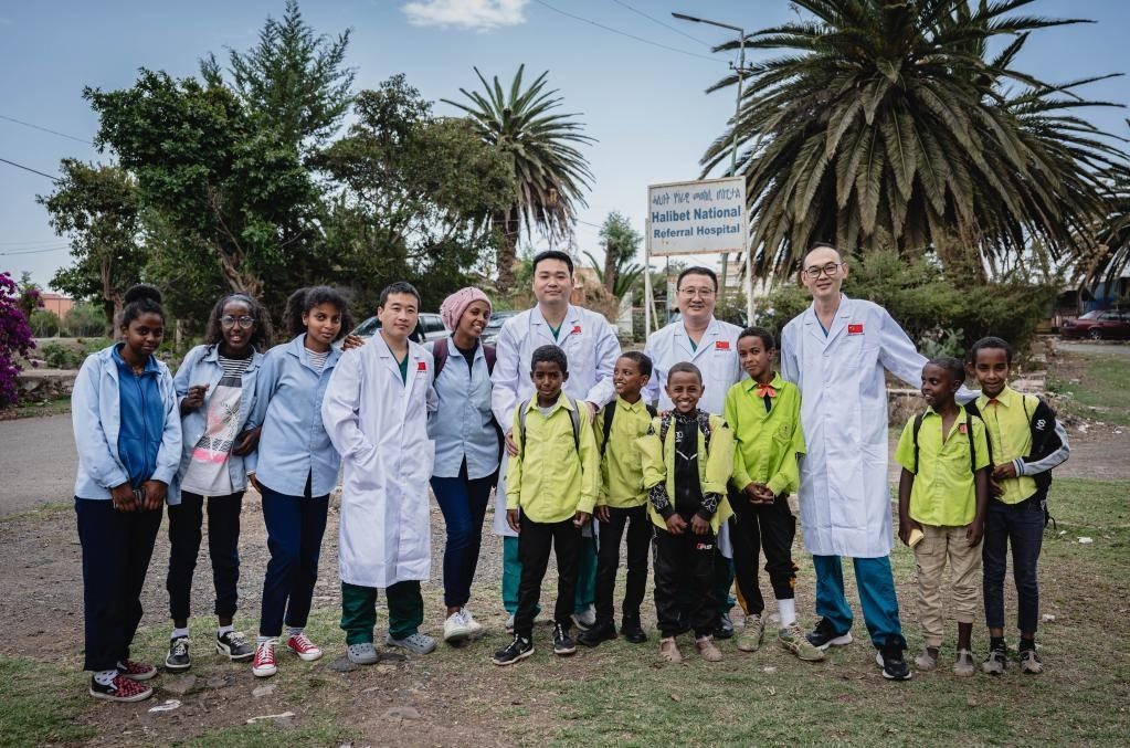 5月9日,在厄立特里亞首都阿斯馬拉的哈利貝特醫(yī)院門口,中國(guó)醫(yī)療隊(duì)隊(duì)員與附近學(xué)校兒童合影。新華社記者王冠森攝