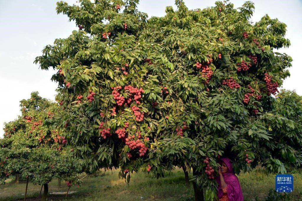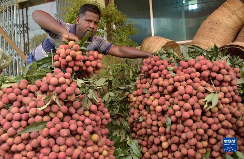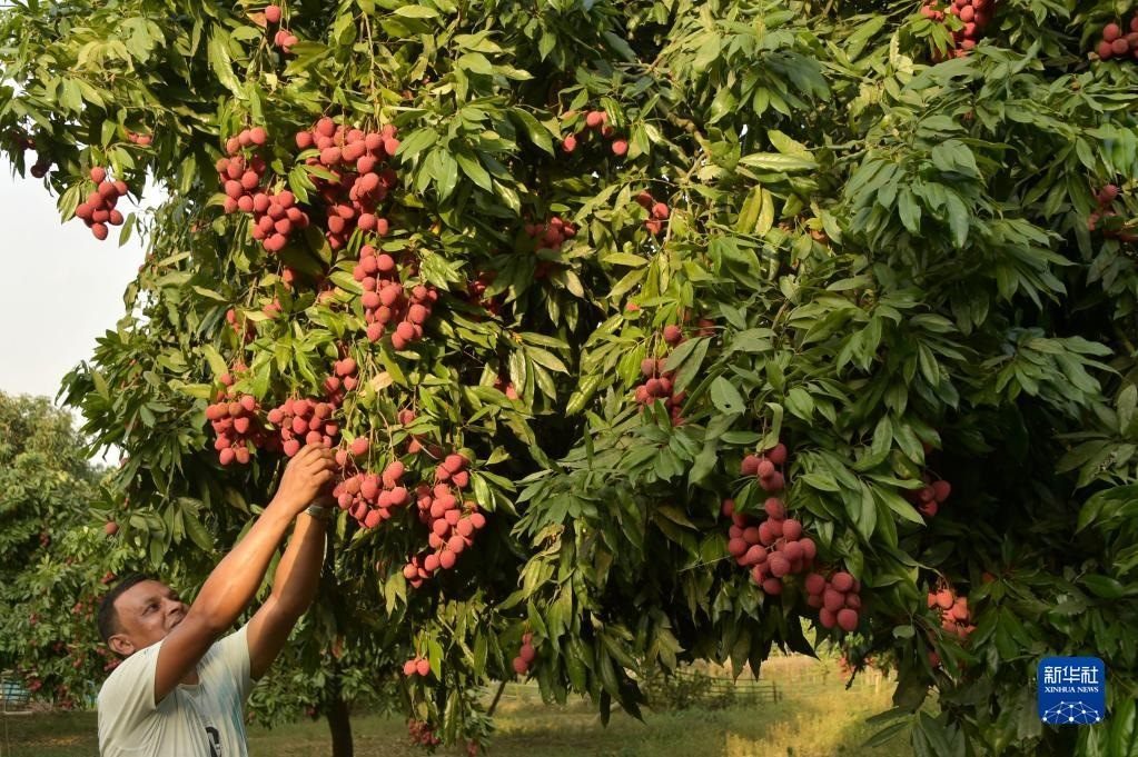 6月4日,農民在孟加拉國迪納杰布爾的果園里采摘荔枝。新華社發(fā)