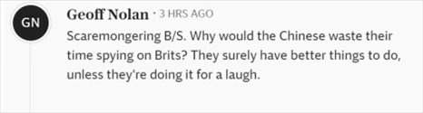“危言聳聽。中國人為什么要浪費(fèi)時間監(jiān)視英國人?他們肯定有更好的事情要做,除非他們這么做是為了搞笑。”