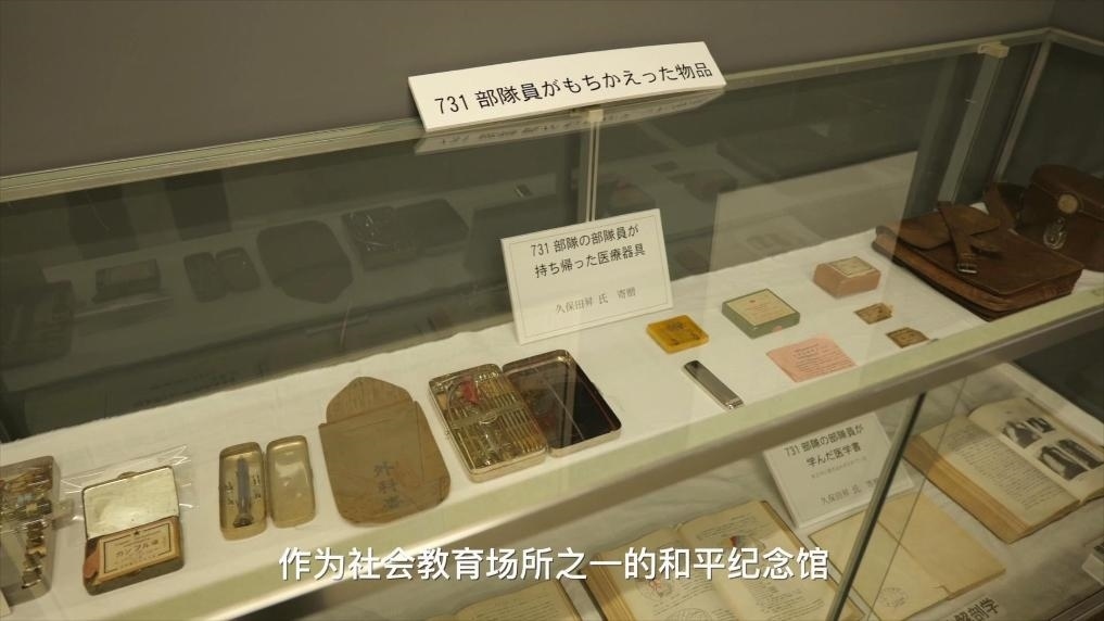 圖為飯?zhí)锸泻推狡砟铕^展廳內(nèi)展出的胡桃澤從731部隊帶回的手術(shù)器具等證物。(視頻截圖)