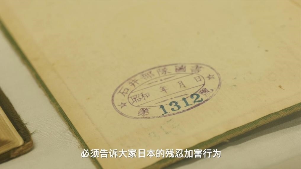 圖為飯?zhí)锸泻推狡砟铕^展廳內(nèi)展出的蓋有“石井部隊”印章的《人體解剖學》書籍內(nèi)頁。(視頻截圖)