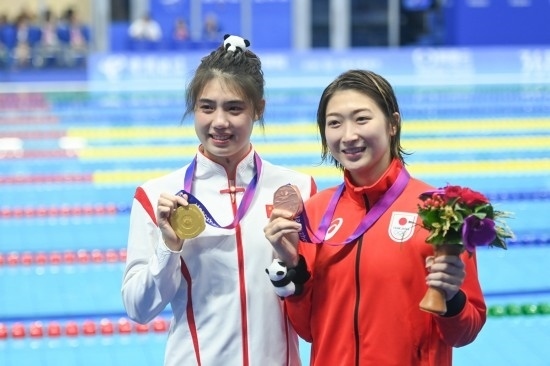 9月29日,冠軍中國選手張雨霏(左)和季軍日本選手池江璃花子在杭州亞運(yùn)會(huì)游泳項(xiàng)目女子50米蝶泳頒獎(jiǎng)儀式后。新華社記者 黃宗治 攝