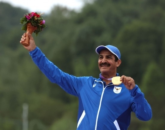 9月27日,金牌得主科威特選手阿卜杜拉·拉希迪在杭州亞運(yùn)會(huì)射擊項(xiàng)目男子雙向飛碟個(gè)人賽頒獎(jiǎng)儀式上。新華社記者 杜瀟逸 攝