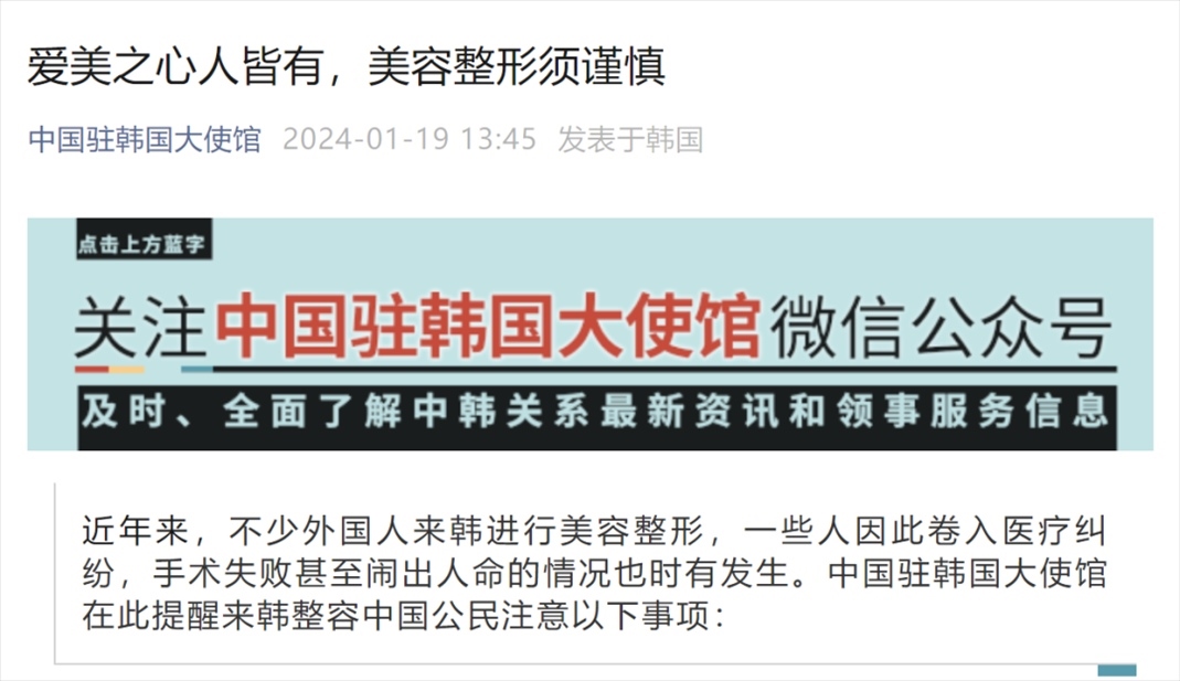 1月19日,中國駐韓國大使館提醒來韓整容中國公民注意以下事項: