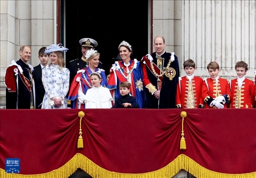 2023年5月6日,凱特王妃(中)在英國倫敦參加英國國王查爾斯三世的加冕儀式后,在白金漢宮陽臺上與民眾見面(資料照片)。新華社記者 李穎 攝