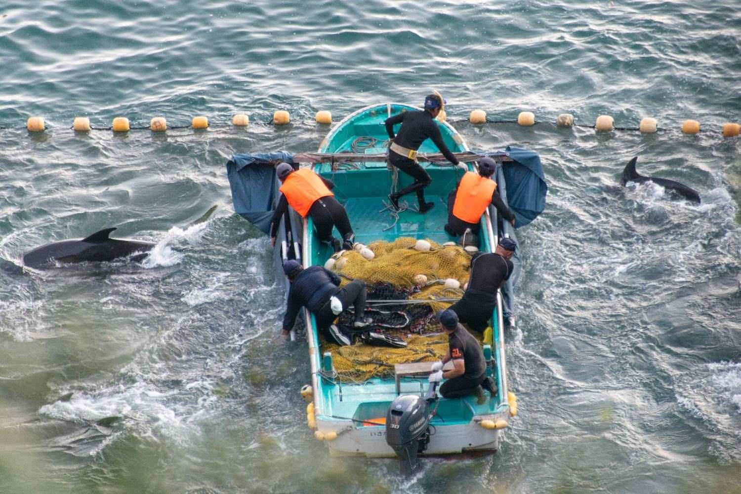 太地町又被稱為“海豚灣”,紀錄片《海豚灣》曾揭露該地屠殺海豚的血腥景象。每年9月到次年3月,捕鯨者們會聚集在太地町,捕殺海豚或其它小型鯨類。捕鯨者們將鋼桿放入海中,用錘子敲打,在水下形成聲墻,這些鋼柱兩端的金屬 "風扇"會放大敲擊聲,使海豚迷失方向。隨后,捕鯨船會逼近海豚,將它們引入 "海灣",拉網(wǎng)誘捕,開啟“挑選海豚”的流程。作為肉類出售的海豚會被血腥屠殺。