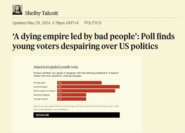 中國日報網(wǎng)5月30日電 當(dāng)?shù)貢r間29日,美國媒體Semafor網(wǎng)站報道,民主黨戰(zhàn)略組織“Blueprint”公布的一項最新民意調(diào)查顯示,美國18歲至30歲的選民中至少有一半人對美國的政治制度持負(fù)面看法,其中超過60%的人認(rèn)為美國正在衰落。