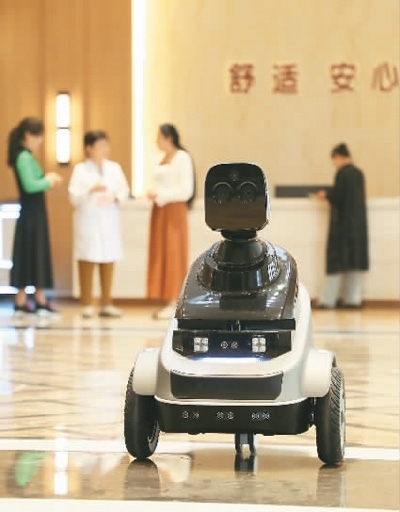 圖為在山東省東營市東營區(qū)德康寧醫(yī)養(yǎng)中心,智能機器人在巡檢。劉智峰攝(人民視覺)