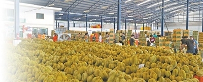 在位于泰國尖竹汶府的優(yōu)果東明水果廠,經(jīng)過分揀和清潔處理的榴蓮按品級分類整齊堆放、等待裝箱。本報記者 白元琪攝