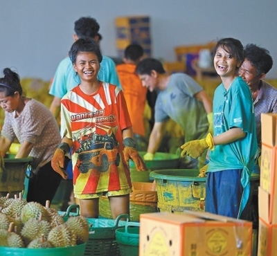 榴蓮是中國第一大水果進口品類。據(jù)統(tǒng)計,2023年中國進口142.6萬噸鮮榴蓮,其中92.9萬噸來自泰國。中國市場的強勁需求,帶動了泰國水果產(chǎn)業(yè)發(fā)展。泰國商業(yè)部數(shù)據(jù)顯示,2024年尖竹汶府的榴蓮產(chǎn)量預(yù)計突破56萬噸,同比增長超4.3%。同時,山竹、龍宮果等熱帶水果的產(chǎn)量也迎來了快速增長?!拔彝扑]了不少親朋好友來水果加工廠上班,收入有保障,旺季的提成更是豐厚!”猜維開心地說。